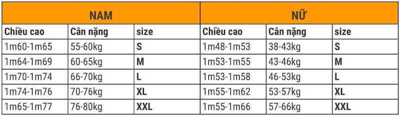 Dựa vào đó, khách hàng có thể lựa chọn size theo chiều cao, cân nặng qua bảng sau đây: